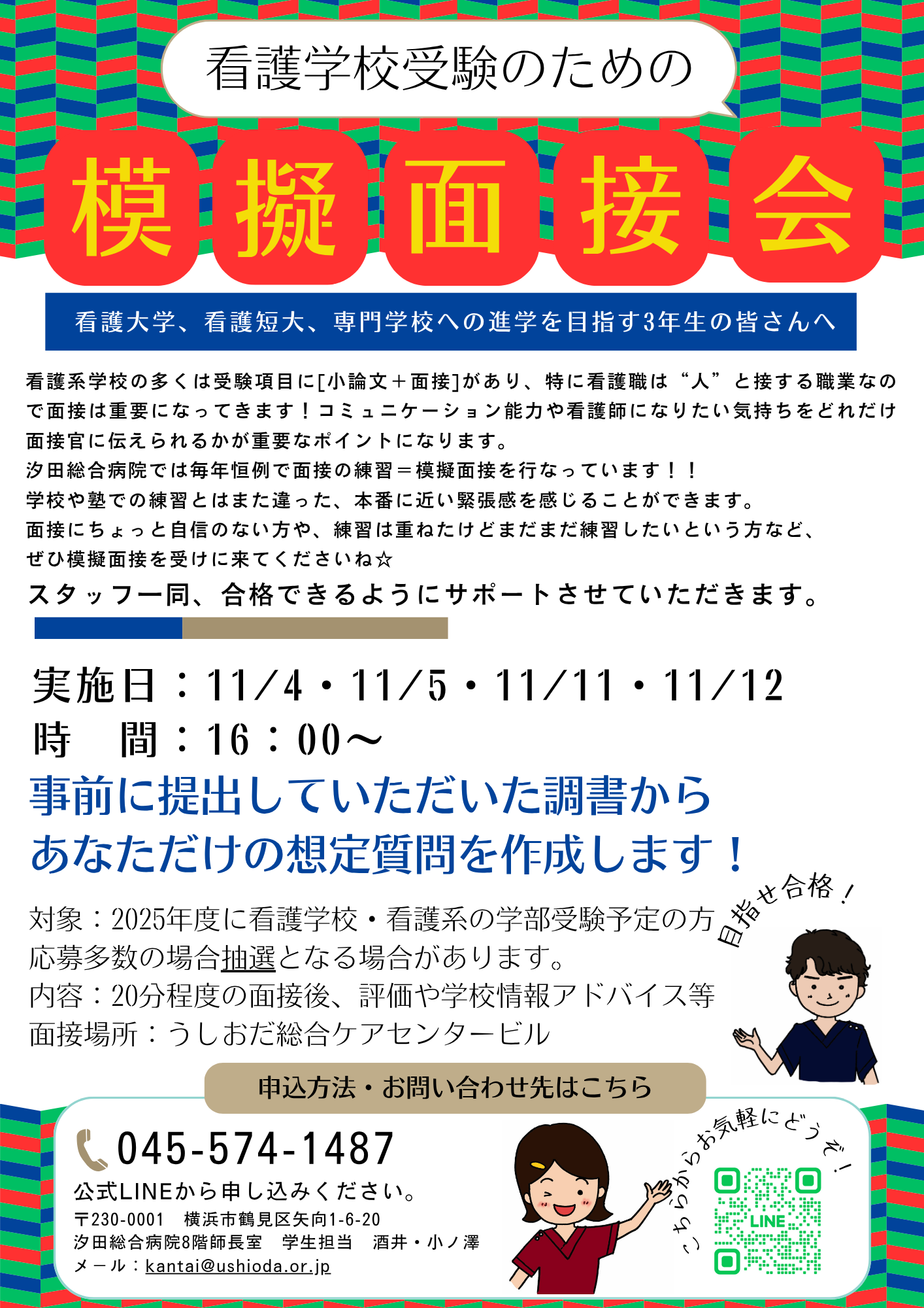 HOME お知らせ 高校生模擬面接 2025/10/21 高校生模擬面接 看護系専門学校・大学を目指す 高校3年生対象 学校や塾で行う練習とは一味違った本番に近い緊張感を感じることができる機会 面接官は当院看護師長と事務管理者が担当します。 事前に提出頂く調書からあなただけの想定質問を作成し、 20分程度の面接の後、評価と面接内容についてのアドバイスを行います。 事前に提出頂く調書からあなただけの想定質問を作成します! 申し込みは汐田総合病院【採用】公式LINEから 前へ 一覧に戻る 次へ