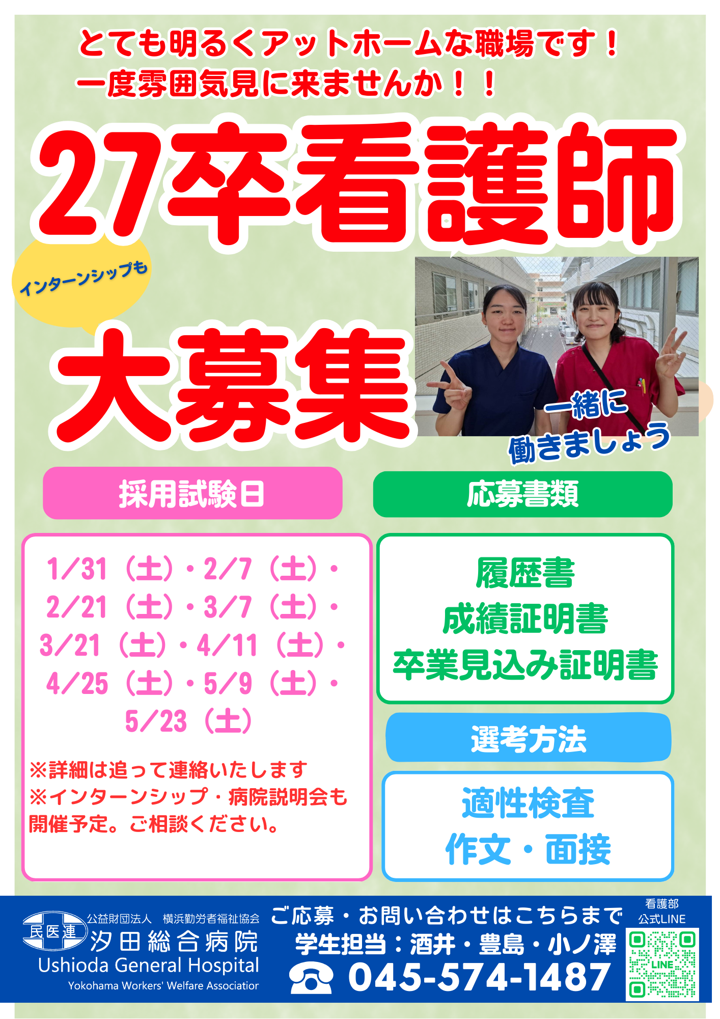 HOME お知らせ ~2027年3月卒対象~ 看護師採用試験 2026/1/26 ~2027年3月卒対象~ 看護師採用試験 -2027年3月卒看護学生対象ー 看護師採用試験 応募資格:看護師および2027年3月看護師資格取得見込みの方 日程:1/31(土)・2/7(土)・2/21(土)・3/7(土)・3/21(土)・4/11(土)4/25(土)5/9(土)5/23(土) 選考方法:適正検査、作文、面接 応募書類:履歴書・成績証明書・卒業見込み証明書 ※詳細は追ってご連絡いたします。 申し込みは公式LINEもしくはGoogleフォームから 前へ 一覧に戻る